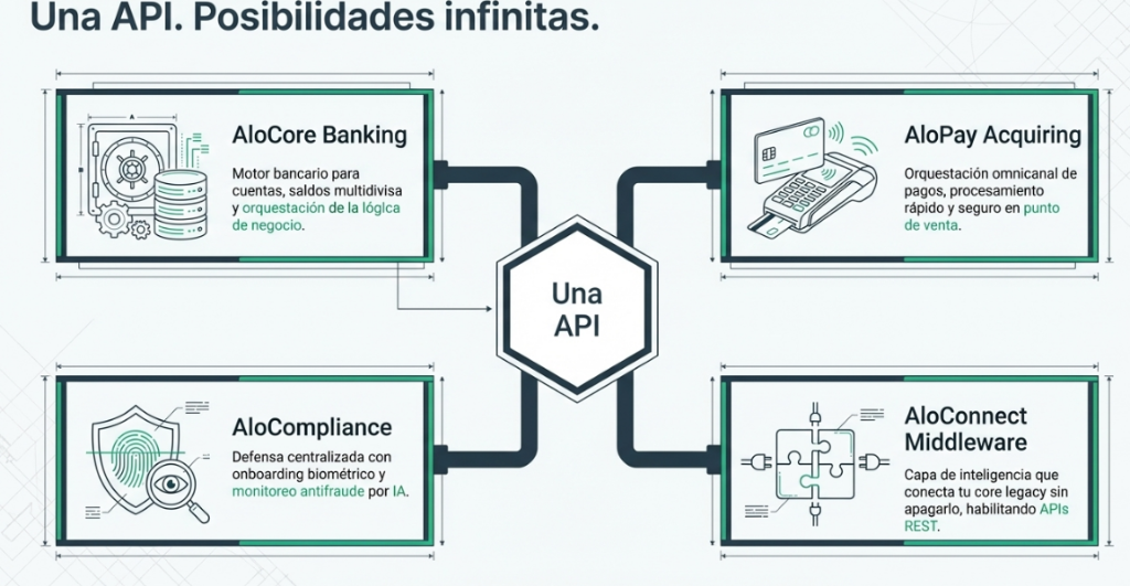 Una plataforma modular integral: **AloCore**, **AloCompliance**, **AloPay**, y **AloConnect**. Todo orquestado a través de nuestra API unificada.