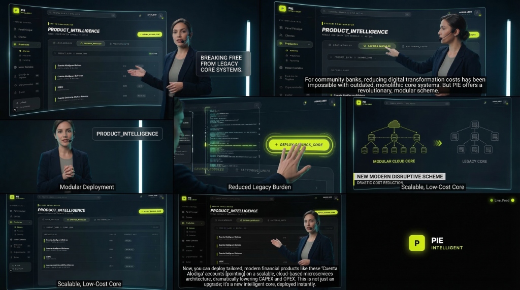 Motor de IA que actúa como cerebro orquestador de productos financieros. PIE trabaja en paralelo con cores bancarios legacy (como AS/400 o Mainframes), permitiendo lanzar productos digitales modernos sin tocar la infraestructura base.